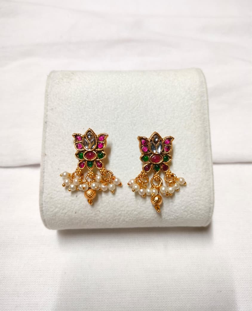 Double layered chains with earrings feature simple, adorned chains of varying lengths for a classic lotus pendant and minimalistic look with beads.