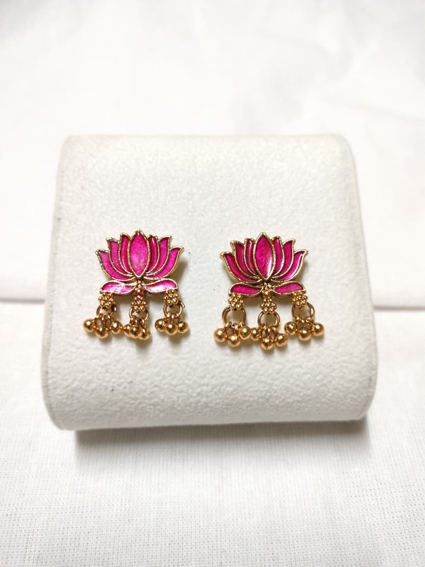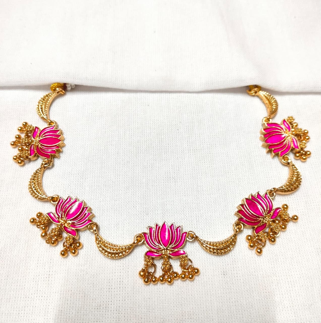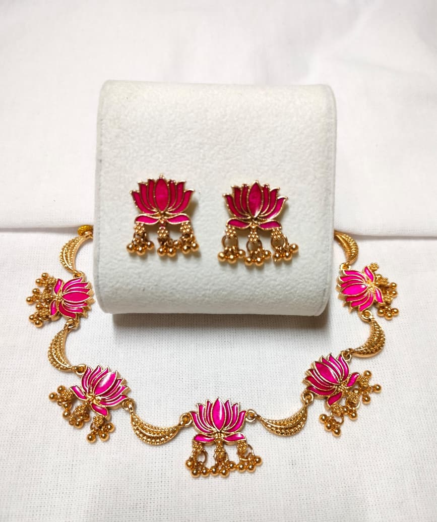 Gold plated Jewelry set with pink floral designs with golden color beads. Festive and functional wear.